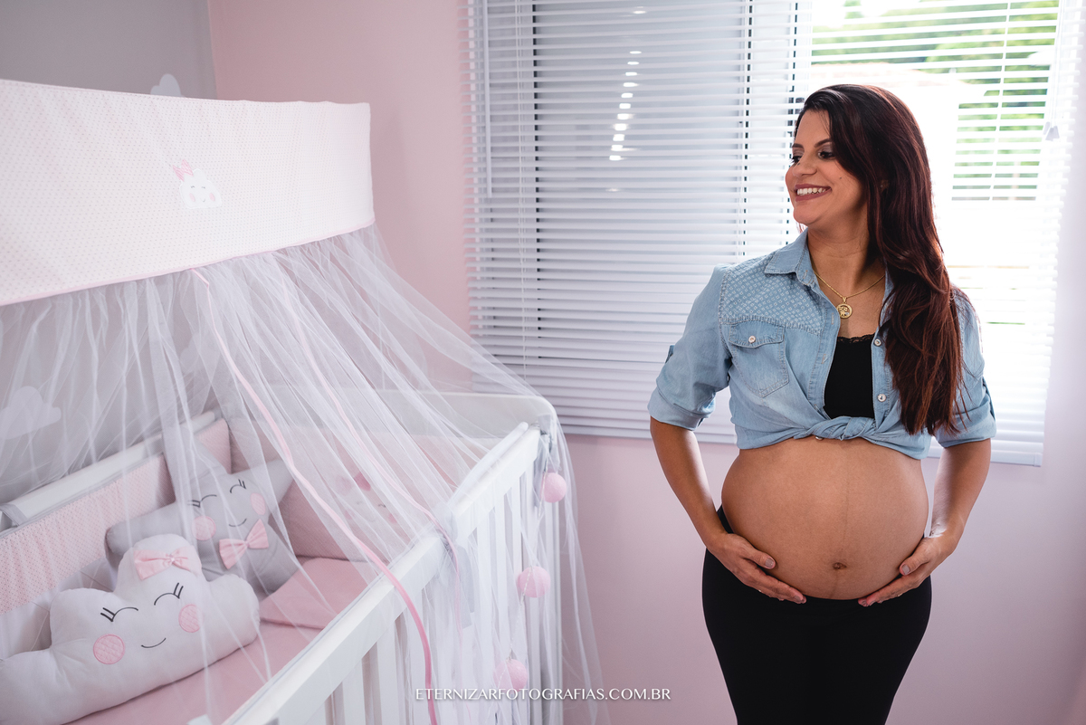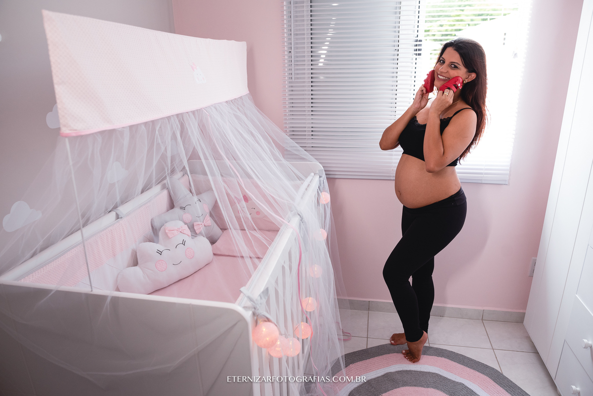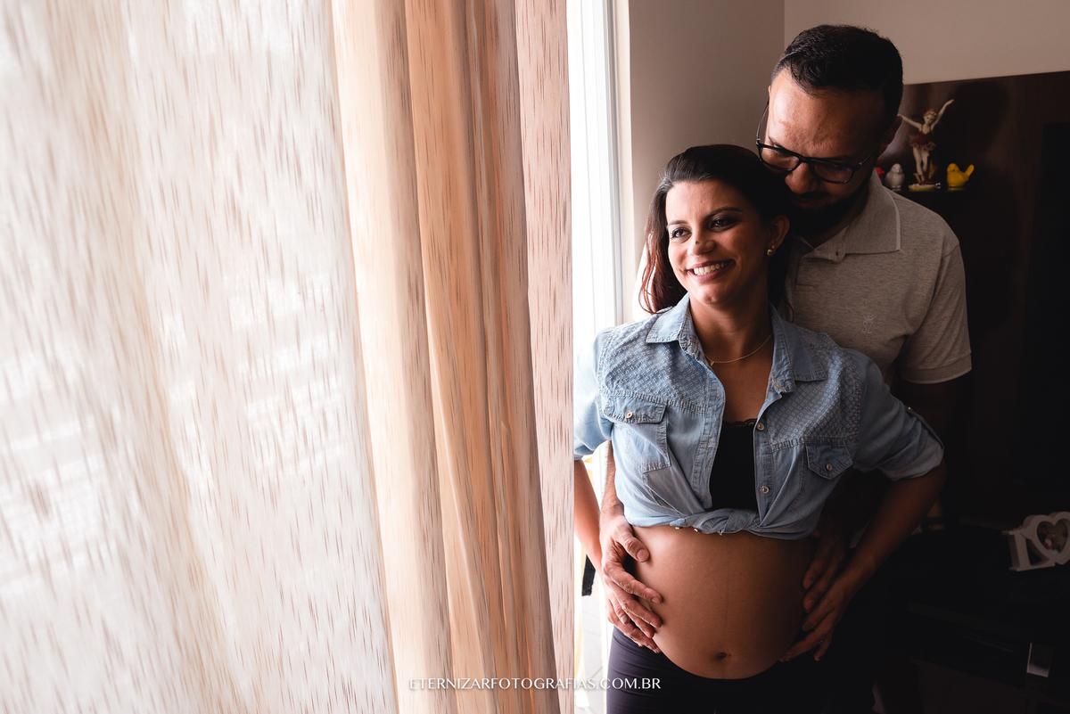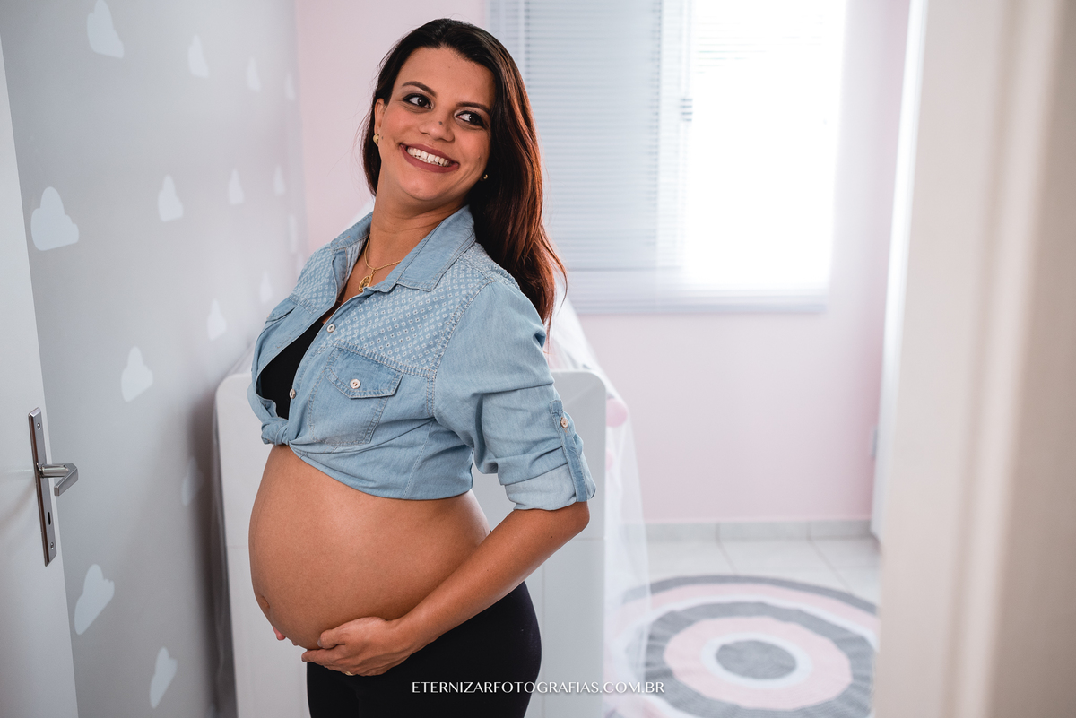 Deus nos presenteou com uma manhã linda, mas a ideia da sessão gestante era justamente fotografar esse lindo momento em seu apartamento, em meio aos detalhes do quartinho da Luisa, no aconchego e conforto desse lar que eles construíram com muito carinho.